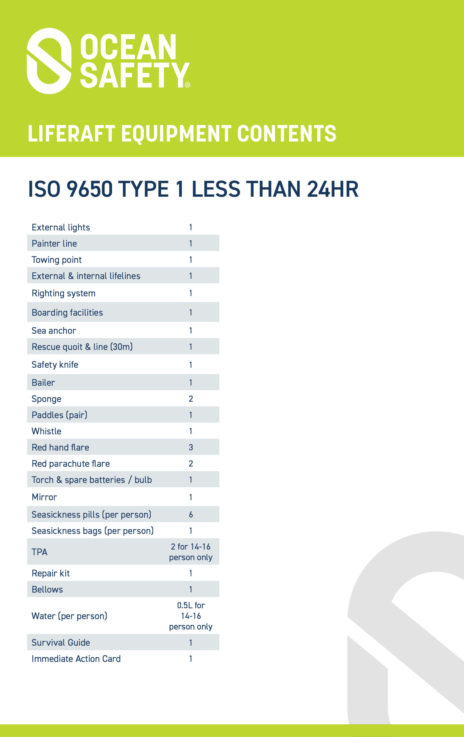 The award winning Ocean ISO 9650 Liferaft is compact and of superior design and construction and has been developed specifically for the global leisure market. This liferaft meets the requirements under current MCA Codes of Practice, Class XII, World Sailing Offshore Special Regulations and French Regulations, Division 240, Division 333. It has also been third party approved to ISO 9650 Type 1 requirements by the Notified Body RINA.