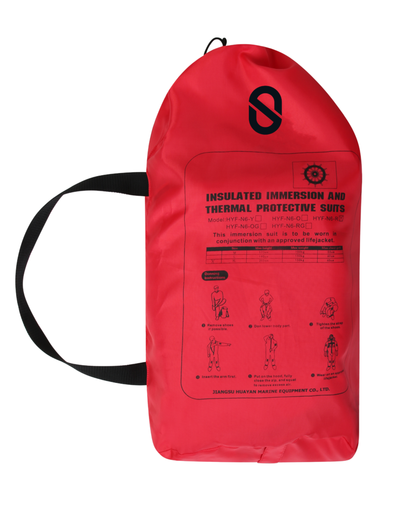 A SOLAS/ MED/ MER approved emergency abandonment suit, designed as an easy to don, single use garment to ensure personnel can evacuate stricken vessels in an emergency situation and aid survival until rescue. The suit offers excellent thermal protection to the wearer via its 5mm fire retardant neoprene, which is further glued and blind stitched to ensure waterproof integrity. It also benefits from an integral lifting strop with built in buddy line, whilst the SOLAS approved reflective tape, located on the hood and arms aids visibility, which in turn aids recovery. Reinforced soles on the feet, offer increased durability and protection. Each suit is supplied in its own carry bag, donning instructions are clearing displayed on both the bag and the suit.